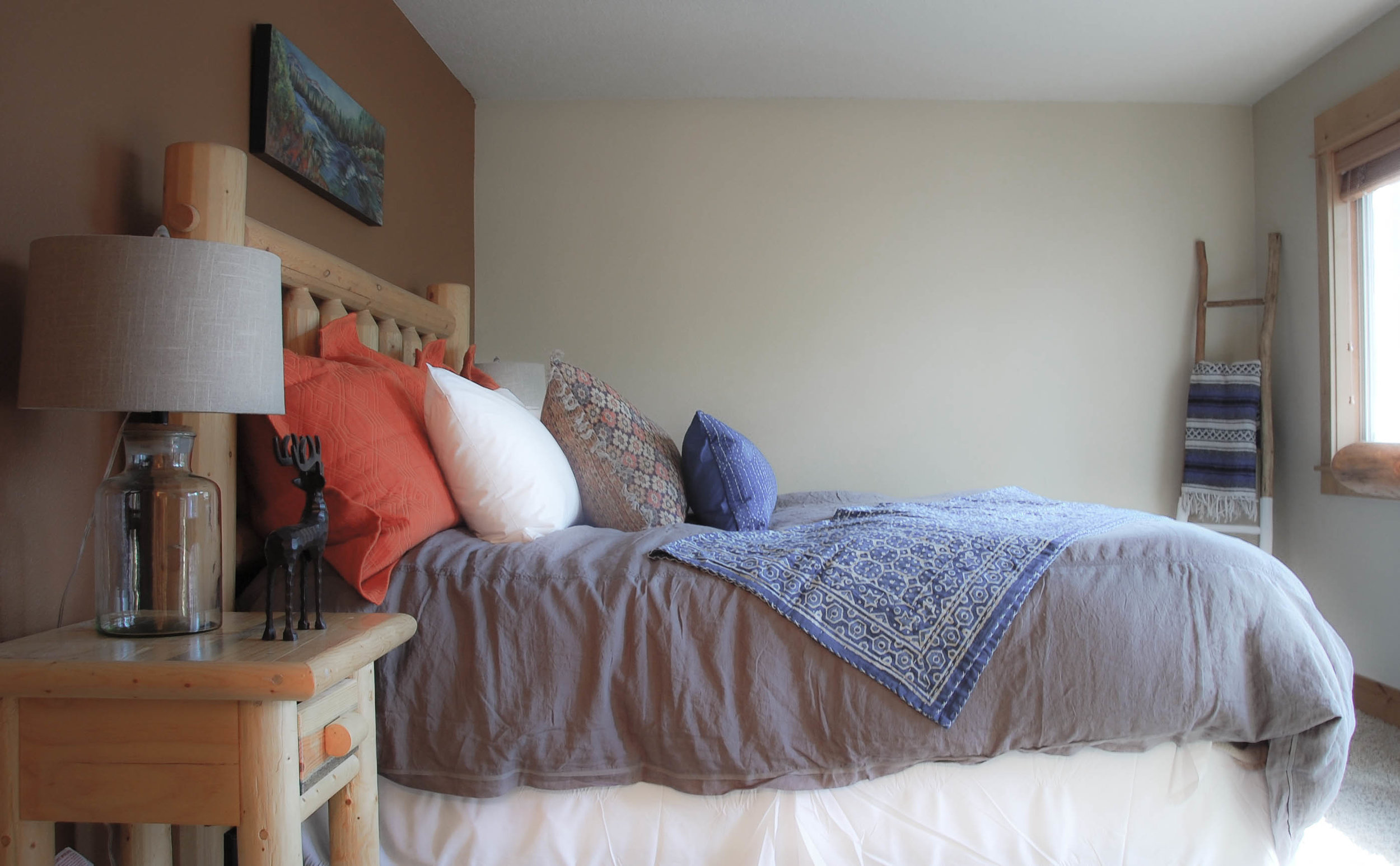 As a child growing up in Southern California, when most kids were busy skateboarding, going to the beach or hanging up Keith Partridge posters in their bedroom, you could most likely find me re-reading a Little House book and obsessing about all things Laura Ingalls Wilder. I was the girl that actually belonged to the Laura Ingalls Wilder fan club at the local library. I would have jumped for the opportunity to give up my banana seat Schwinn, Toot a Loop radio and Morey boogie board, in exchange for the pioneer girl life of churning butter, shopping for calico and traveling the country in a covered wagon. The highlight of my childhood were our family vacations were we left the crowded suburbs of Huntington Beach and travelled deep into the Oregon coastal woods. These rustic wilderness trips were always short lived but planted the seed for my own future move to Oregon and the purchase of my own Little House in the Big Woods outside of Bend. This weekend my husband and I spent some time at the "little house" updating our master bedroom. Ok, so Brian actually spent his time chopping down some trees and I fixed up the bedroom - but he drove so he gets an honorable mention. This house has a definite "lodge" interior including lodge pole furniture (which is perfect as this home does double duty as a lodge resort rental). However, the bedroom had a funky traditional polyester tapestry and velvet comforter set. The prior owners had also painted one wall of the master bedroom a brownish/rust color. I wanted a more casual look to the room and wanted to incorporate more organic natural fabrics and was totally prepared to paint out the accent wall. I found a stunning bedding set at Pine Cone Hill that ended up working so well we left the accent wall as is. I also incorporated a fun blanket ladder and switched out the fancier lamps for these beauties. Overall I am very happy with the look. I didn't plan on this but the colors also coordinate with the patio furniture right out side the bedroom's sliding glass door. The room has its own little private patio with a hot tub (another selling point on the home) and I had repurposed some old patio furniture my parents give me not knowing how everything would tie together in the end...Destiny!